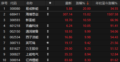 周末机构继续吹储能、锂电池,据天风电新,电池超预期下率先开始抢货材料,部分材料和客户已经开始涨价。今天储能、锂电池板块高开冲高,亿纬锂能一度涨超10%,阳光电源再创新高。
