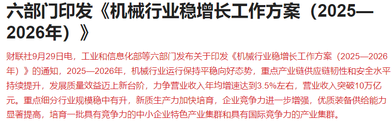 工业和信息化部等六部门发布关于印发《机械行业稳增长工作方案(2025—2026年)》的通知。