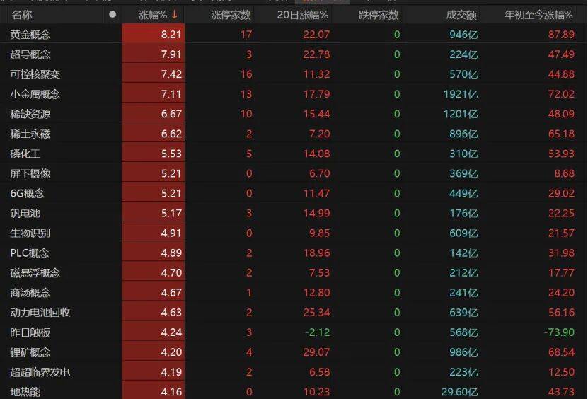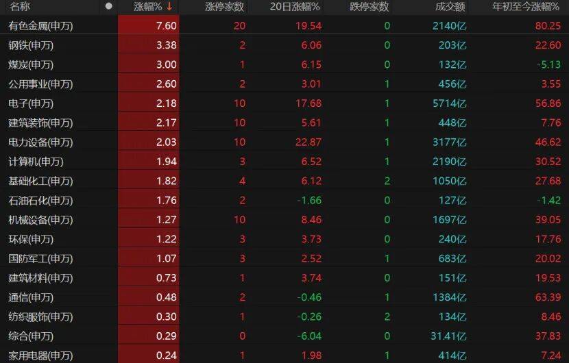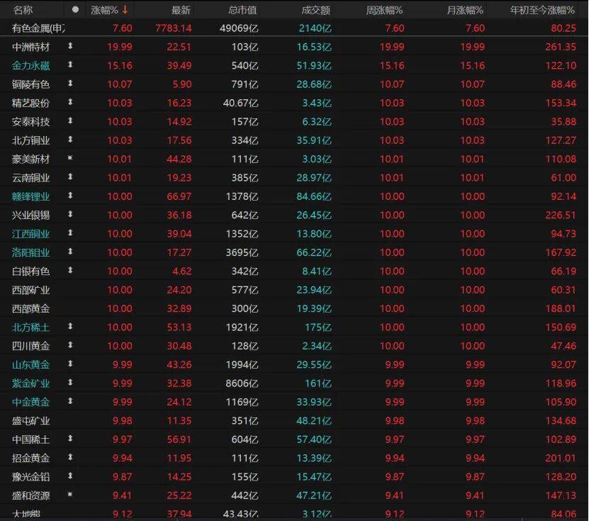 有色金属板块收涨7.6%,20只相关个股涨停。其中,中洲特材“20cm”涨停,金力永磁收涨15.16%报39.49元/股,铜陵有色、精艺股份、安泰科技、北方铜业、豪美新材、云南铜业、赣锋锂业、兴业银锡、江西铜业等个股涨停。
