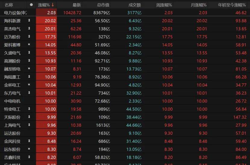 电力设备板块也表现不错,10只相关个股涨停,海科新源、英杰电气“20cm”涨停,迈为股份、爱科赛博、久盛电气、高测股份涨幅均超过10%,中电电机、特变电工、上海电气涨停。