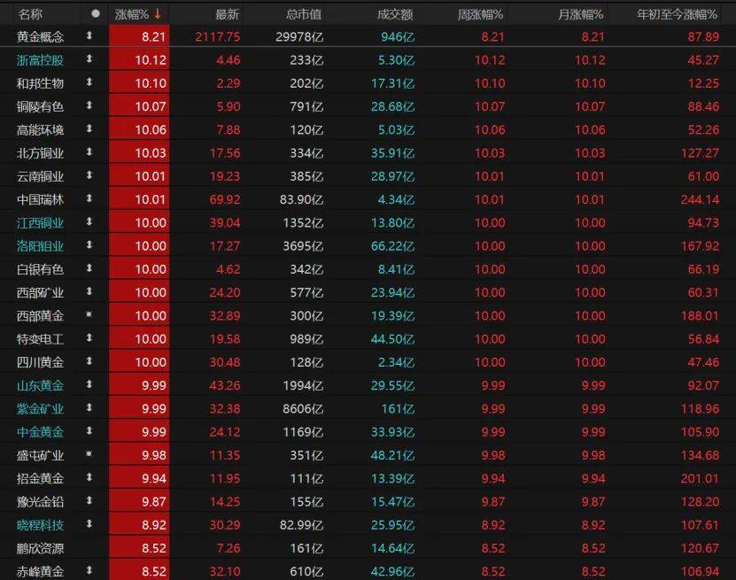 浙富控股、和邦生物、铜陵有色、高能环境、云南铜业、中国瑞林、江西铜业等概念股涨停。