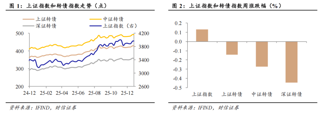 核心观点:保持转债参与度,挖掘结构性机会。节前一周转债市场小幅震荡,高估值环境下跟涨能力相对较弱。展望后市,正股层面,元旦假期A股休市期间,海外市场中国资产表现较好,纳斯达克中国金龙指数上涨4.38%、恒生科技上涨4.00%、恒生指数上涨2.76%,科技成长板块表现强势;此外,跨年后保险、公募等机构资金或季节性回流,增量资金共振下,正股“春季躁动”行情大概率延续演绎,节后A股有望迎来开门红。估值层面,尽管高估值下转债性价比低于正股,但在正股慢牛预期和供需矛盾下转债高估值有望得到支撑,保持转债市场参与度,更多挖掘结构易机会。策略上,建议均衡配置防御和成长板块,一方面是银行、公用事业等大盘、高评级标的,具备红利和防御属性,同时受益于大盘底仓转债稀缺性凸显;另一方面,正股“春季躁动”行情下建议关注科技、有色金属等板块中的低溢价率优质标的,逢低布局增强组合弹性。主线)科技板块,如AI算力、商业航天、机器人、脑机接口等方向;2)地缘政治事件驱动的军工、油气、贵金属方向;3)反内卷相关方向,可关注化工、光伏、锂电等;4)内需政策预期方向,新消费以及养老、生育等“十五五”规划的重点方向。