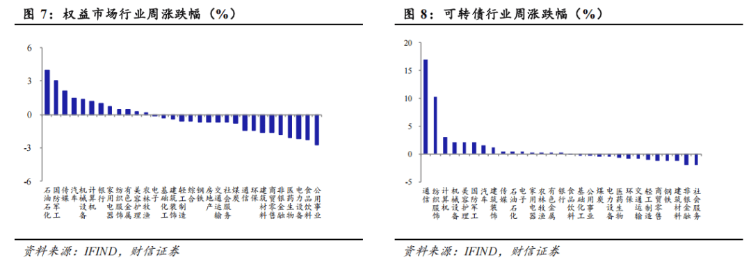 行业表现。权益市场来看,石油石化、国防军工、传媒等行业表现相对较好,周涨跌幅分别为3.92%、3.05%、2.13%;公用事业、食品饮料、电力设备等行业表现相对较弱,周涨跌幅分别为-2.72%、-2.26%、-2.18%。转债市场来看,通信、纺织服饰、计算机等行业表现相对较好,周涨跌幅分别为16.95%、10.21%、2.98%;社会服务、非银金融、建筑材料等行业表现相对较弱,周涨跌幅分别为-1.96%、-1.92%、-1.28%。