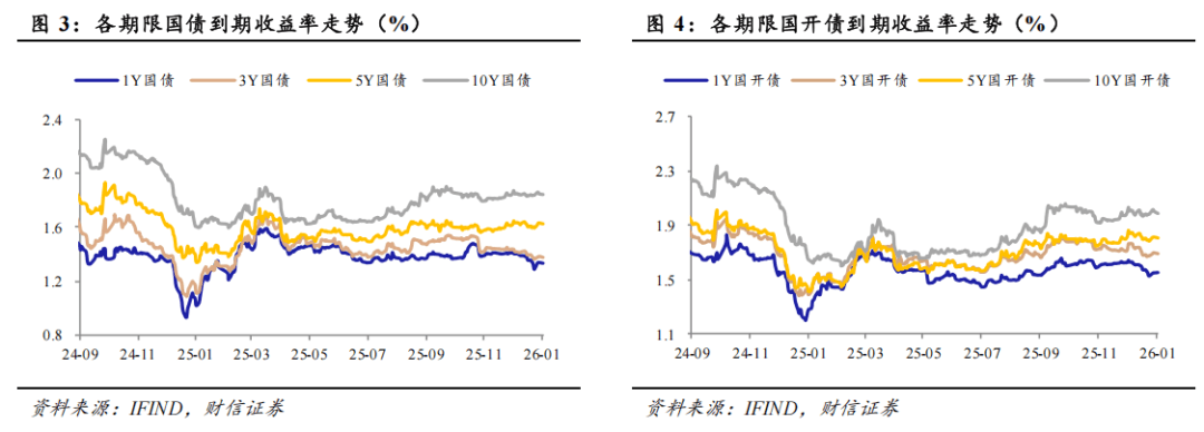 利率债收益率普遍上行。1月4日,1年期国债到期收益率收于1.33%,周环比上行5BP;10年期国债到期收益率收于1.84%,周环比上行1BP。1年期国开债到期收益率收于1.55%,周环比上行2BP;10年期国开债到期收益率收于1.99%,周环比持平。
