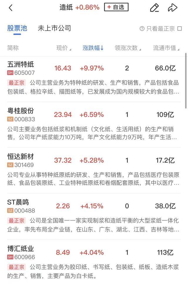 造纸概念反复走强,五洲特纸风涨停,恒达新材、博汇纸业、ST晨鸣等个股跟涨。