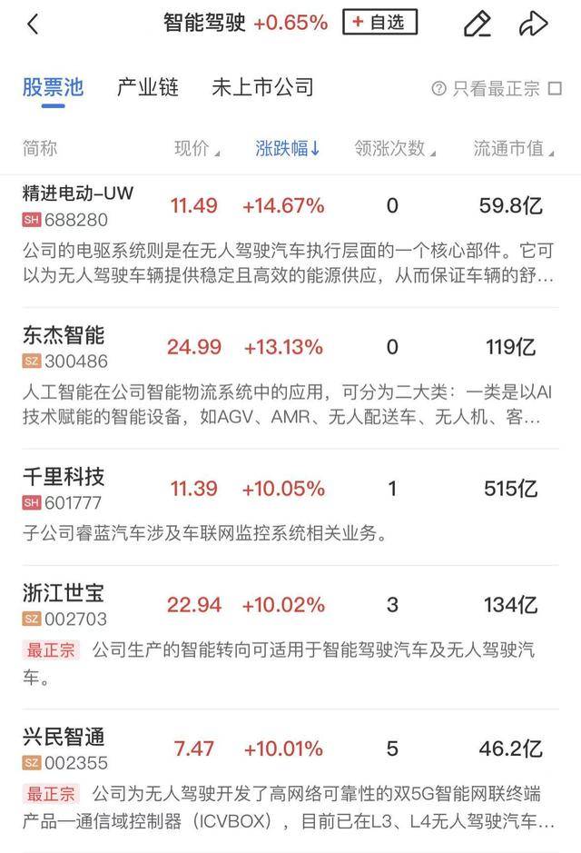 智能驾驶概念盘中活跃,千里科技、浙江世宝、兴民智通、天奇股份、克来机电等个股涨停,精进电动、杰华特、万集科技等涨幅居前。