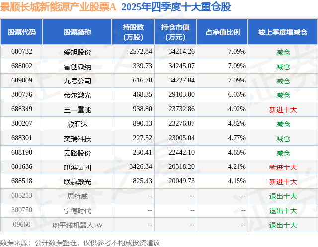 根据2025基金年报公募基金重仓股数据,重仓该股的公募基金共15家,其中持有数量最多的公募基金为景顺长城基金的景顺长城新能源产业股票A。景顺长城新能源产业股票A目前规模为20.37亿元,最新净值1.5508(2月25日),较上一交易日上涨0.81%,近一年上涨28.72%。该公募基金现任基金经理为杨锐文 曾英捷。杨锐文在任的基金产品包括:景顺长城优选混合,管理时间为2014年10月25日至今,期间收益率为372.7%;景顺长城环保优势股票,管理时间为2016年3月15日至今,期间收益率为360.4%;景顺长城创新成长混合,管理时间为2019年10月17日至今,期间收益率为117.41%;景顺长城成长领航混合,管理时间为2020年5月28日至今,期间收益率为82.79%。曾英捷在任的基金产品包括:景顺长城精锐成长混合A,管理时间为2025年11月21日至今,期间收益率为31.8%。